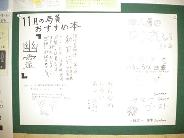 11月のオススメ本のテーマは2年生が考えた『 けもの/獣 』と『 幽霊 』です。連日ニュースで熊の被害が流れているのとあわせて、怖いものつながりで幽霊を連想してテーマに選んだようです。獣はあえて、犬・猫以外をイメージした本を、幽霊は夏のイメージが強いのですが、季節外れを気にせずに本を選んでいます。POPは多目的ホールの掲示板に、ポスターは各階廊下や談話室に掲示しています。おすすめ本のリストや局員のコメントは