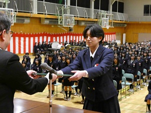 本日、卒業式を明後日に控えた3年生が約1か月ぶりに登校し、同窓会入会式、スケート部全国優勝表彰式、そして商業科卒業生表彰式を行いました。