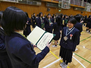 2時間目は、思い出の写真と歌詞つきのスライドをみながらの校歌練習、全道入賞者等への表彰伝達式(簿記部、ワープロ部、書道部、美術部、クッキング部、バトントワラー部、スケート部、ソフトボール部、読書感想文コンクール(1年吉國さん)、全商ビジネス計算実務検定満点賞(2年長谷さん)、南商伝統の漢字コンクールの表彰式が行われました。その後の2学期終業式では、千葉校長から「“幸運は準備された心にのみ宿る”、短い期間の冬休みですが、頑張るところは頑張り、楽しむところは楽しむメリハリをつけた良い時間を過ごしてください」とのお話がありました。