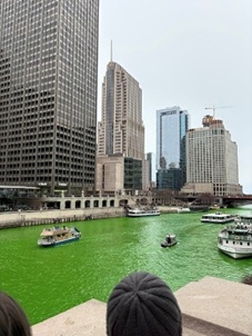 現地学校への最終登校日。ほんの数日とはいえ,日本の学校との違いを体験できる貴重な機会となりました。放課後は,ゲームセンターへ。ここでも日本にはないものが多くあり,楽しく過ごすことができました。マディソンでの研修を終えた一行は,コーディネーターの方と共にシカゴへ。まずシカゴ美術館を訪れた一行。行く前はあまり興味を抱いていなかったツアー参加生徒たちでしたが,見比べていくうちに,いろいろな違いを発見し楽しむことができたようです。この日はちょうどセントパトリックデー(アイルランドにキリスト教を広めた聖人聖パトリックの命日)のパレードが行われており,多くの人が緑のものを身につけ,川までも緑に染まるという珍しい光景を目にすることができました。これまで滞在していた街とはまた異なる雰囲気といつも食べているものとは異なる形のシカゴピザを食べることができ,充実した時間となりました。