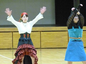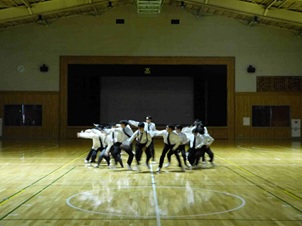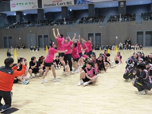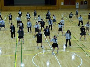 3年生がクラスごとに体育の授業で取り組んだ創作ダンスの発表会が行われ1、2年生が交代で体育館2階ギャラリーから観覧しました。