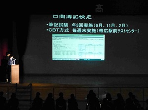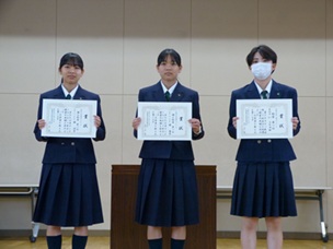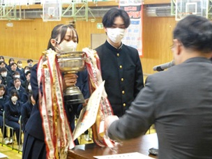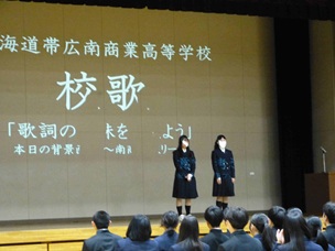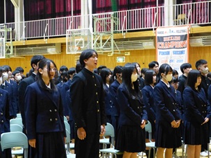 2時間目は、思い出の写真と歌詞つきのスライドをみながらの校歌練習、全道入賞者等への表彰伝達式(簿記部、ワープロ部、書道部、美術部、クッキング部、バトントワラー部、スケート部、ソフトボール部、読書感想文コンクール(1年吉國さん)、全商ビジネス計算実務検定満点賞(2年長谷さん)、南商伝統の漢字コンクールの表彰式が行われました。その後の2学期終業式では、千葉校長から「“幸運は準備された心にのみ宿る”、短い期間の冬休みですが、頑張るところは頑張り、楽しむところは楽しむメリハリをつけた良い時間を過ごしてください」とのお話がありました。