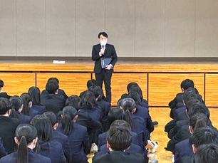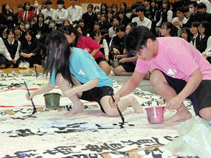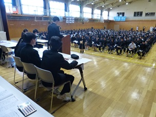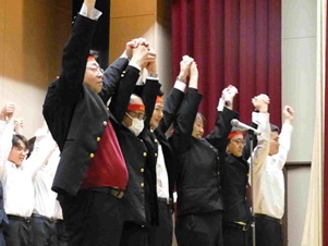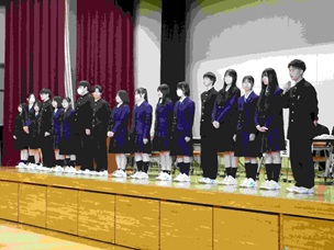 先生方からの激励をはじめ、各クラス就職希望者の代表者1名が決意表明を述べ、さらに在校生を代表して応援団・吹奏楽部・バトン部・書道部が合同パフォーマンスによるエールを送りました。