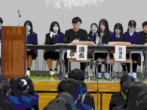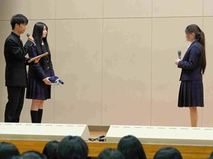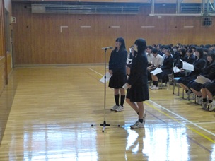 第74期生徒会長の佐野さんによる最後の挨拶、第75期生徒会中央委員たちの自己紹介と今後の抱負が語られた後、生徒大会が開催されました。