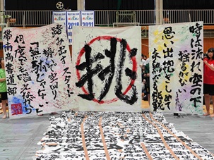 午前:成功祈願祭(開祭式) 体育館で行われた成功祈願祭では、校長先生と生徒会長の挨拶に続き、オープニングムービーが上映されました。吹奏楽部・バトン部・書道部による迫力あるパフォーマンスや教員による出し物も披露され、会場は大いに盛り上がりました。