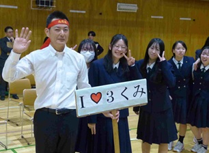 この3年生を送る会では、バトントワラー部・吹奏楽部・書道部のパフォーマンスと12組の有志によるバンド演奏・ダンス・カラオケ・マジックなどバラエティに富んだ発表が行われ、終始盛り上がりました。また、3年生の担任団による合唱、メッセージ、エールでは、涙をぬぐう場面もありましたが、最後は全校が一体となり最高のフィナーレを迎えました。後輩によるアーチと紙吹雪で見送られた3年生とアビーさん。南商での経験や思い出を大切にしてください。ありがとう!