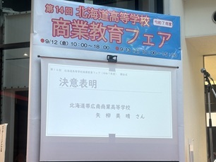 9月12日(金)・13日(土)道内の商業に関する科目を学ぶ生徒が、商品の開発や販売等に関する学習活動を実践するとともに他校の生徒及び道民との交流を通してコミュニケーションやプレゼンテーション能力を高めることを目的とした北海道高等学校商業教育フェアに参加してきました。道内21校が一堂に会し、学校や地域の特色を活かした商品を販売していました。