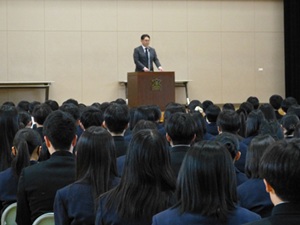 続く始業式では、生徒たちは整然とした態度で式に臨みました。千葉校長からは「時間は皆平等。高校生活でしかできないこともあります。全力で楽しんでください」と、短くも力強いメッセージが送られました。
